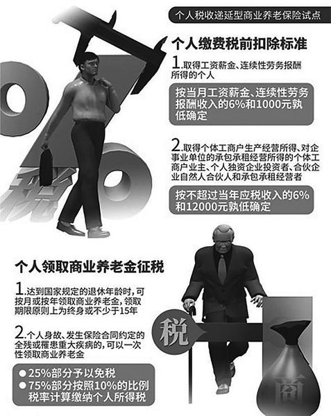 根据试点通知,个人缴费税前扣除标准,就是指个人用来买符合国家规定的商业养老保险产品的钱,上限按月收入的6%计算,最高不超过1000元。对于取得个体工商户生产经营所得、对企事业单位的承包承租经营所得的个体工商户业主、个人独资企业投资者、合伙企业自然人合伙人和承包承租经营者,税前可扣除部分也是按当年应税收入的6%计算,最高不超过12000元。