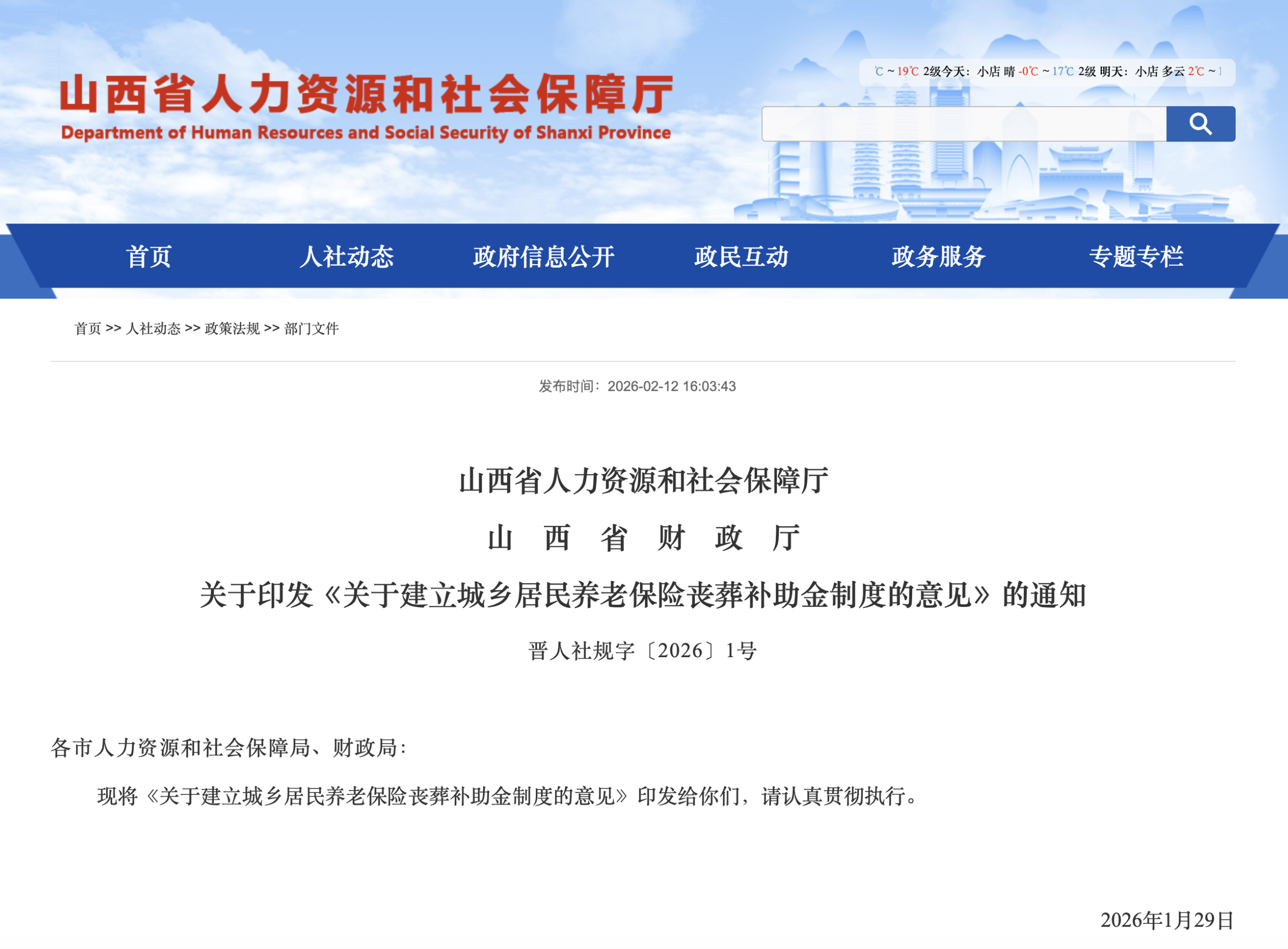 为进一步完善我省城乡居民养老保险制度,切实提高参保人员待遇水平,根据《国务院关于建立统一的城乡居民基本养老保险制度的意见》(国发〔2014〕8号)精神,结合我省实际,决定从2026年1月1日起,在全省建立城乡居民养老保险丧葬补助金制度,现提出如下意见: