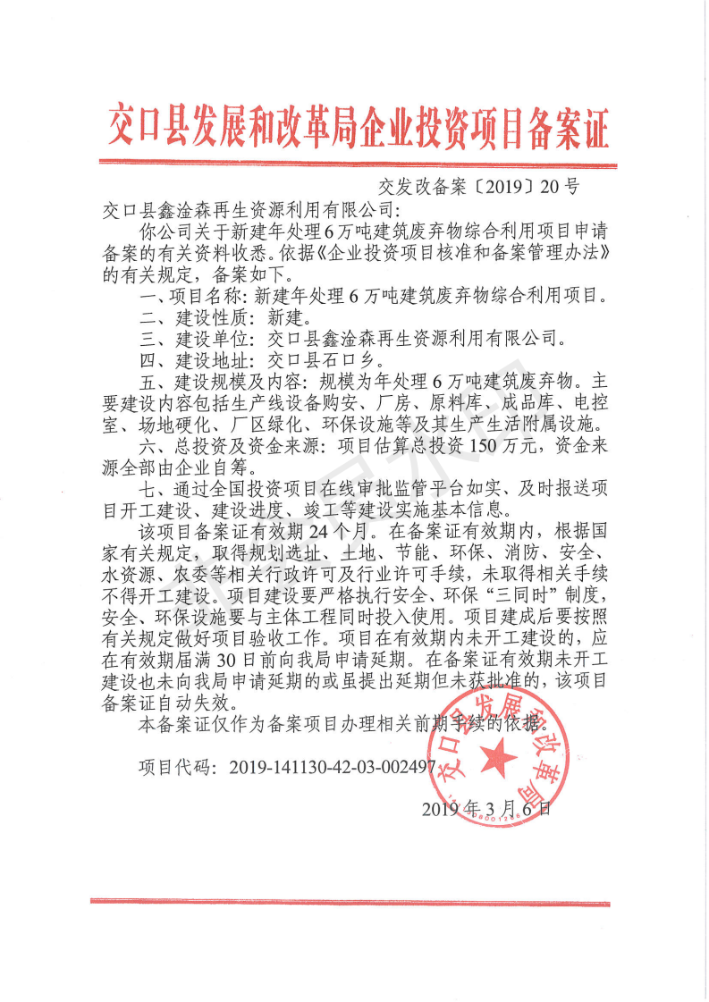 交口县发展和改革局企业投资项目备案证