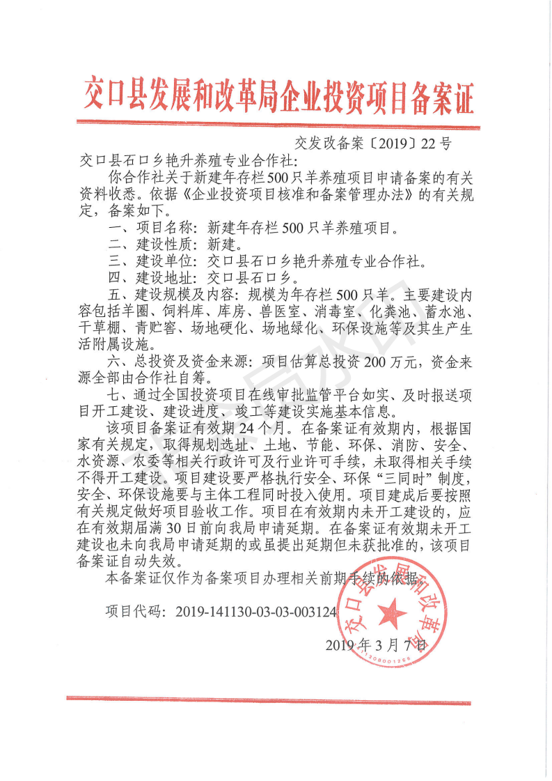 交口县发展和改革局企业投资项目备案证