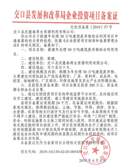 交口县发展和改革局企业投资项目备案证