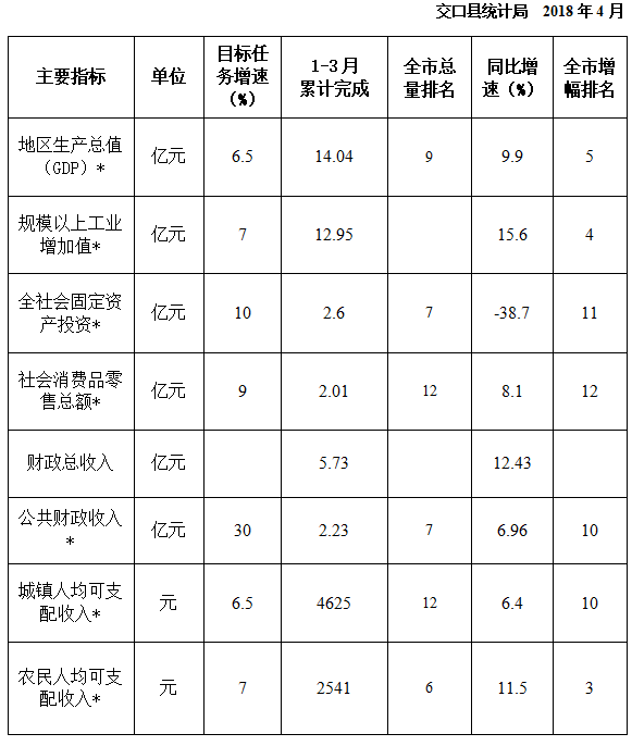 交口县2018年1—3月份经济社会发展主要经济指标完成情况