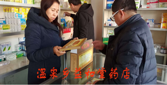 图为我局桃红坡所所长王秀萍、保化股股长刘建军、不良反应中心主任贺海亮在温泉乡益和堂药店在对不同品类、不同批次的药品、保健品进行检查。