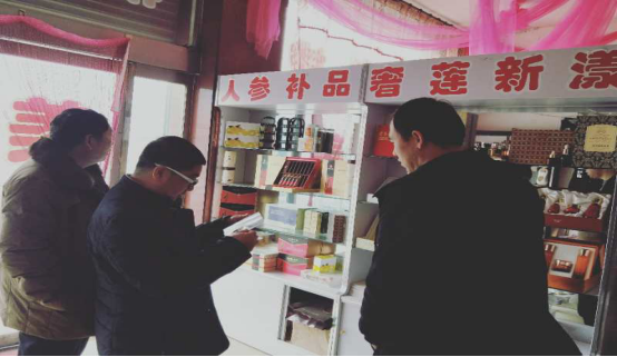 图为我局康城所副所长黄永平、保化股股长刘建军、不良反应中心主任贺海亮在对康城镇保健食品化妆品进行检查。
