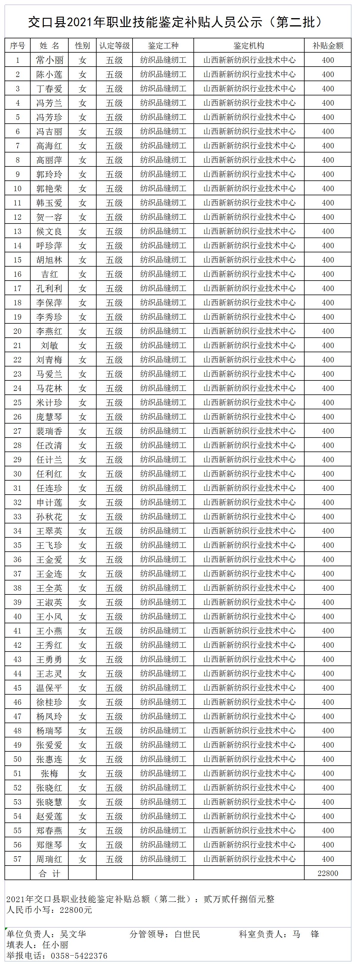 交口县2021年职业技能鉴定补贴人员公示(第二批)