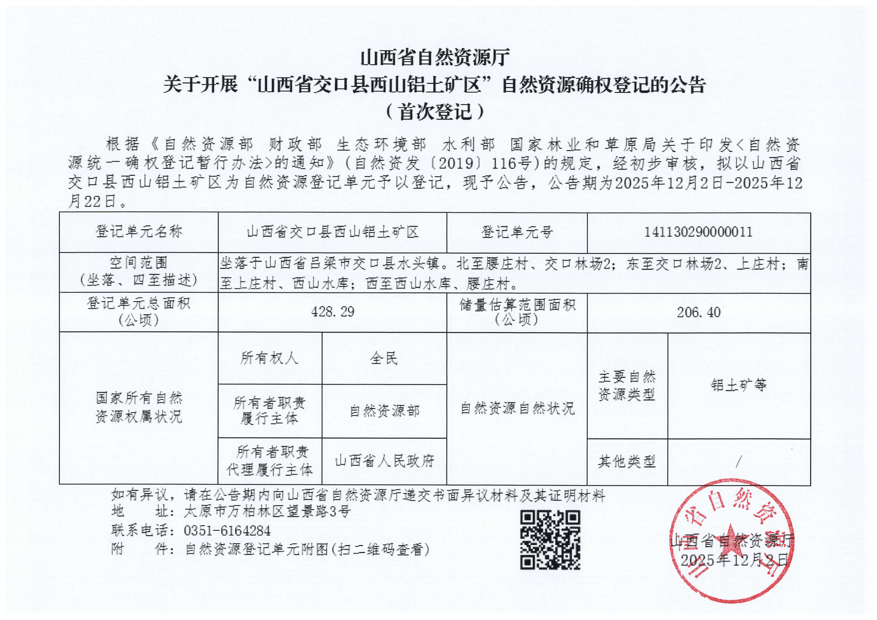 关于开展“山西省交口县西山铝土矿区”自然资源确权登记的公告
