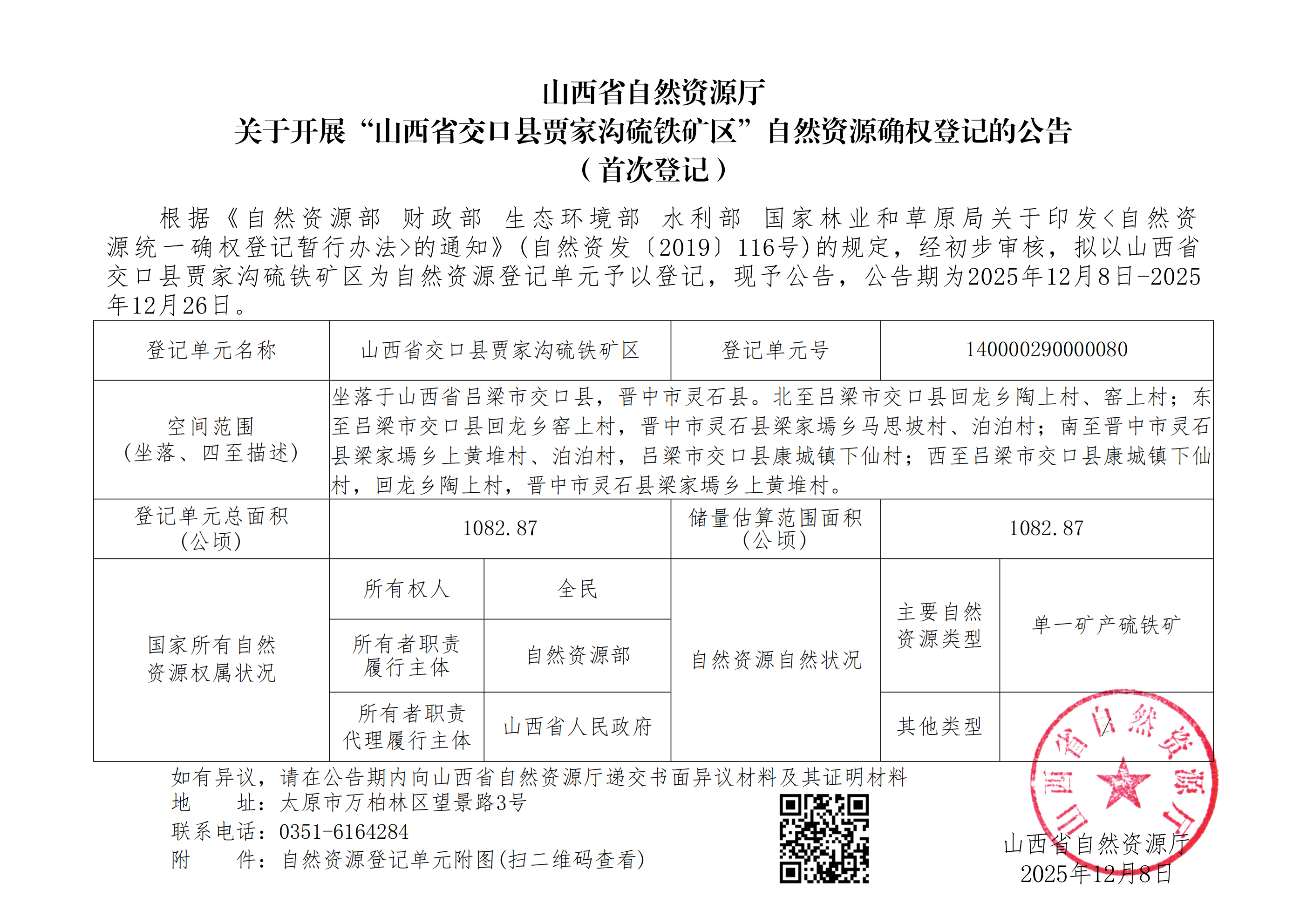 关于开展“山西省交口县贾家沟硫铁矿区”自然资源确权登记的公告