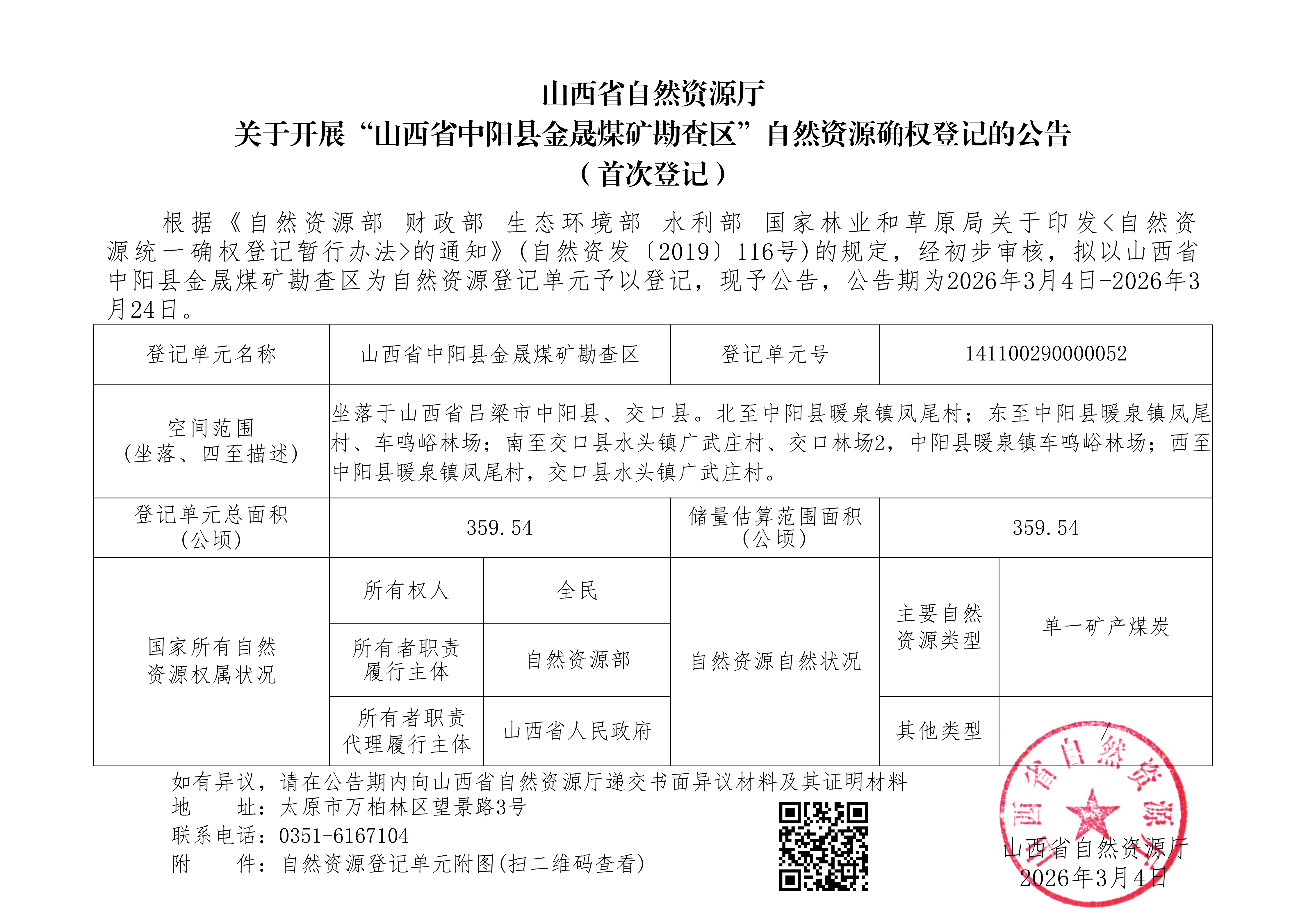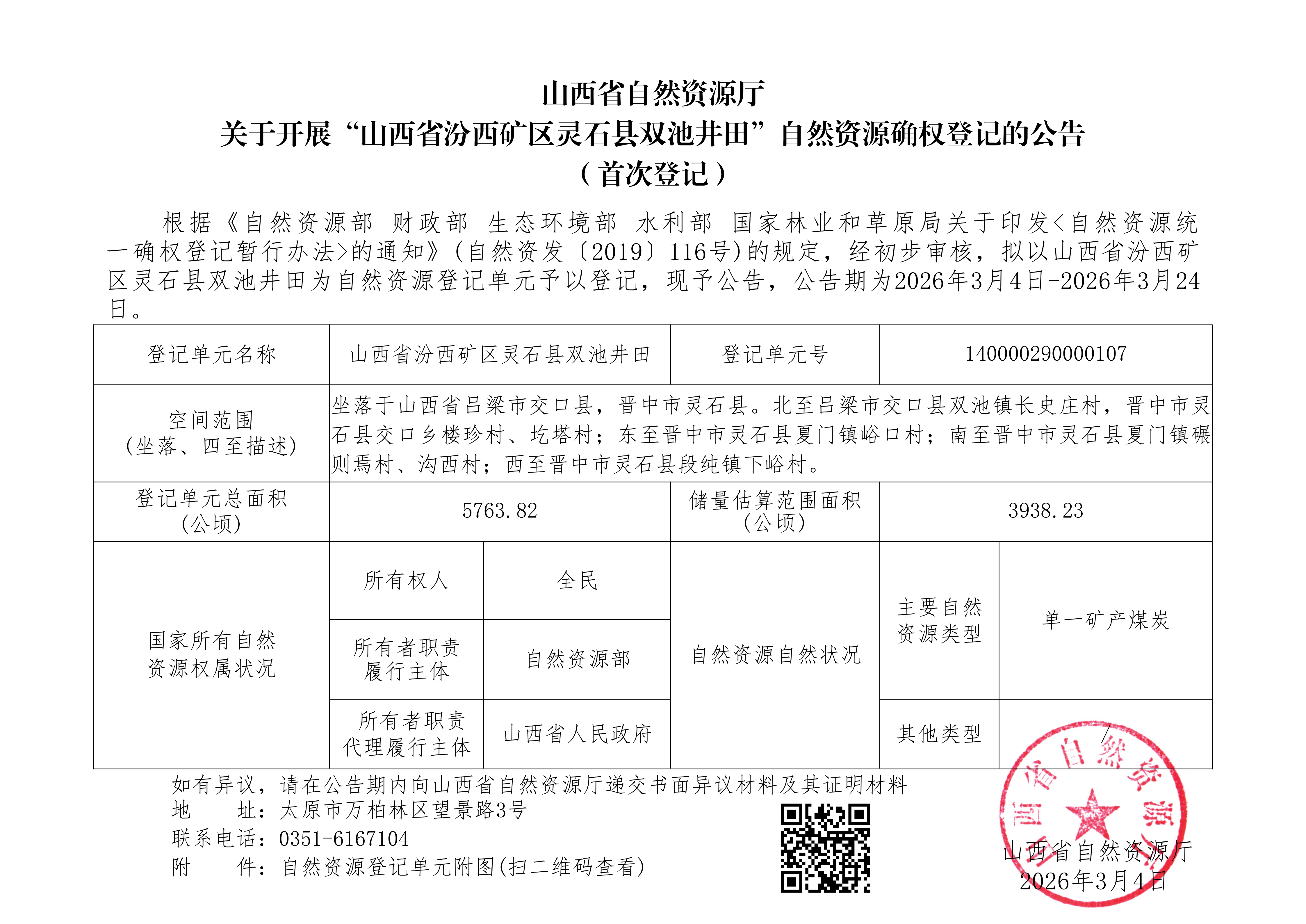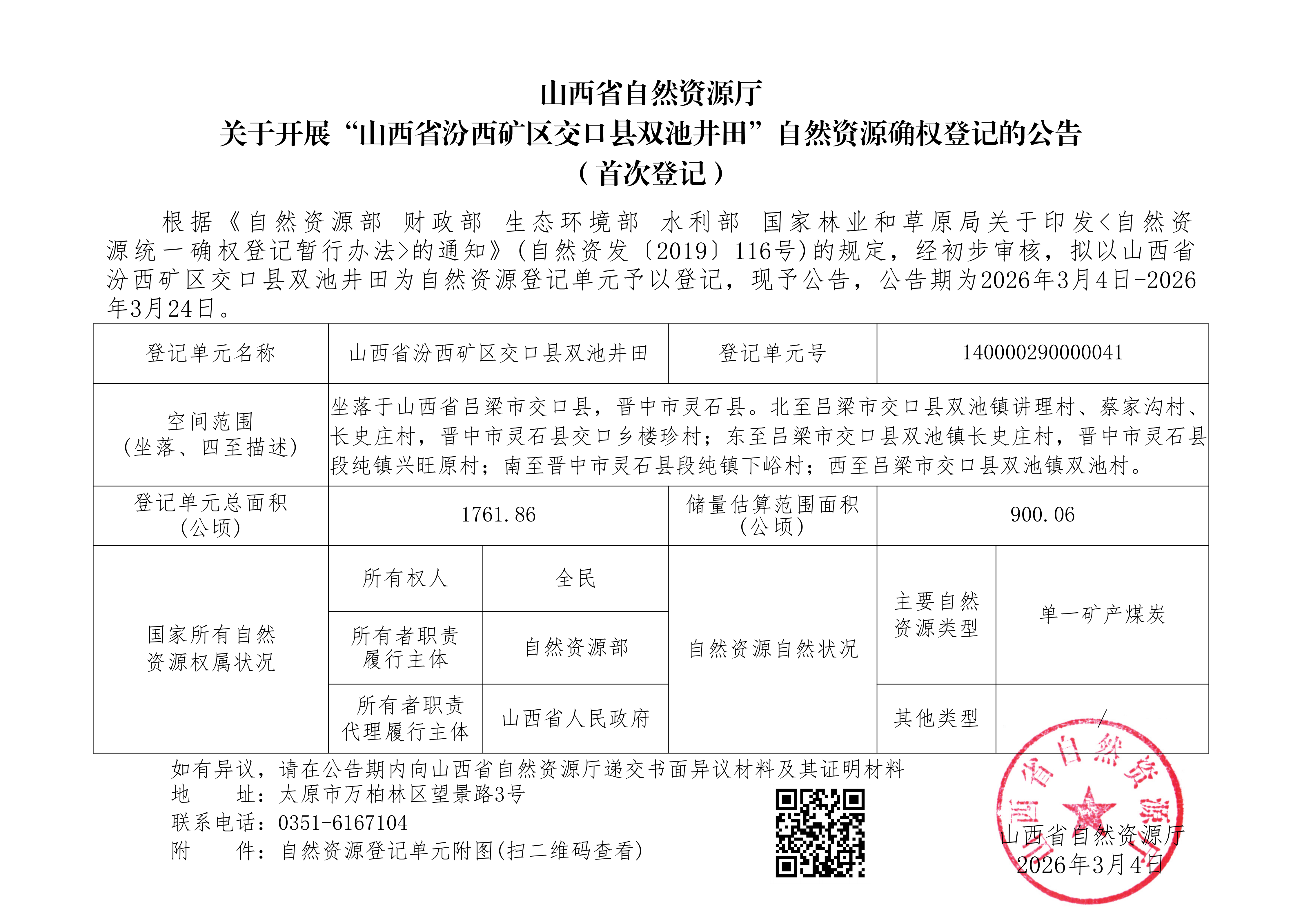 关于开展“山西省汾西矿区交口县双池井田”自然资源确权登记的公告