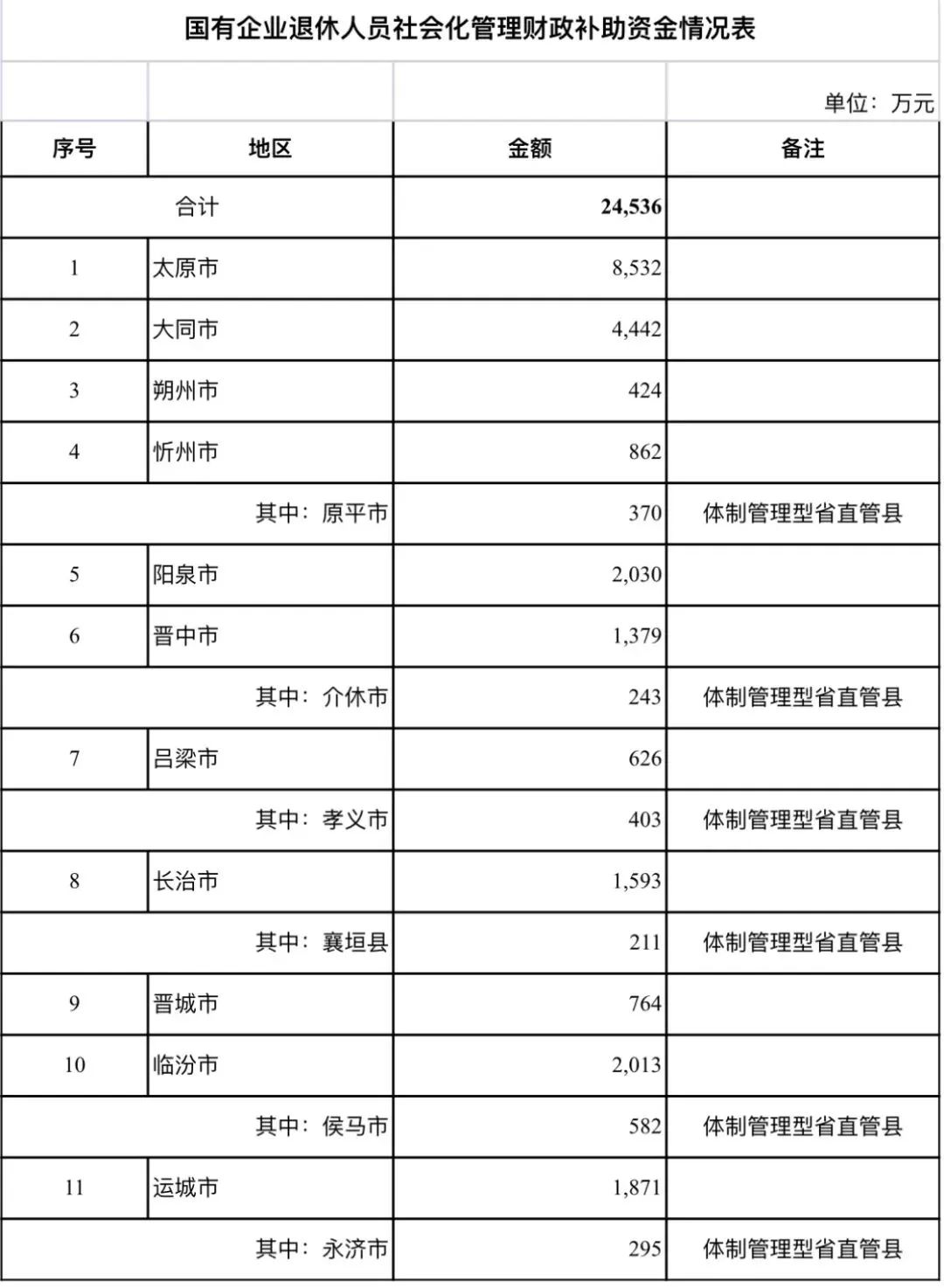 11月16日,山西省财政厅发布“关于提前下达2024年国有企业退休人员社会化管理补助资金预算的通知”。根据财政部相关通知及山西省国资委意见,就提前下达相关市、体制型省直管县该补助资金预算事项通知如下。
