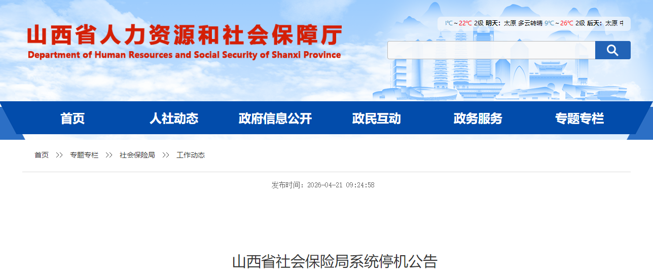 按全年工作安排,因对吕梁市、晋中市养老保险、工伤保险、失业保险系统进行三险合一升级改造,决定于2026年4月25日18时至2026年4月30日24时,全省社保经办机构三项保险线上平台、线下系统和民生山西APP暂停服务,2026年5月1日8时起恢复运行。