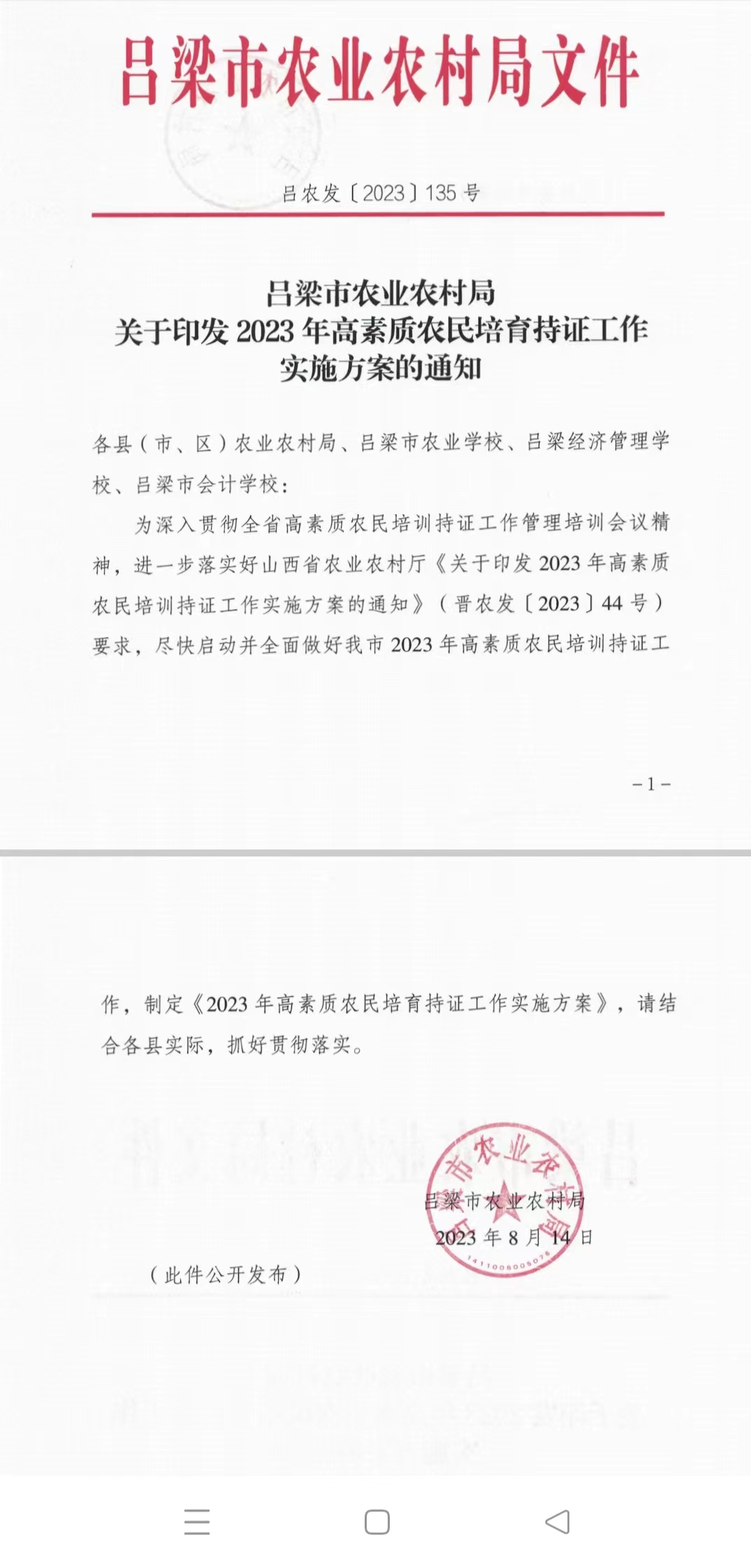 依据《吕梁市农业农村局关于印发2023年高素质农民培训持证工作实施方案的通知》吕农发〔2023〕135号文件,交口县开展新型职业农民培训。