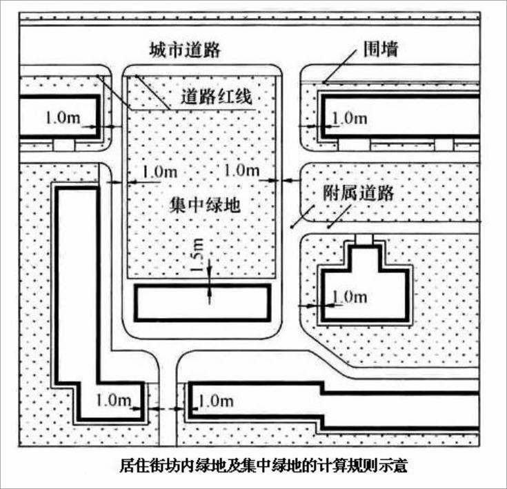 (3)当集中绿地与城市道路临接时,应算至道路红线;当与居住街坊附属道路临接时,应算至距路面边缘 1.0m 处;当与建筑物临接时,应算至距房屋墙脚 1.5m 处。
