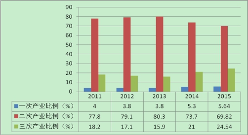 “十二五”期间,全县工业经济迅猛发展,使县域经济总量和发展实力得到跃升,三次产业大致处于农业稳步提升、工业快速增长、服务业趋优向好的发展态势,三次产业比重由4:77.8:18.2变为5.64:69.82:24.54。